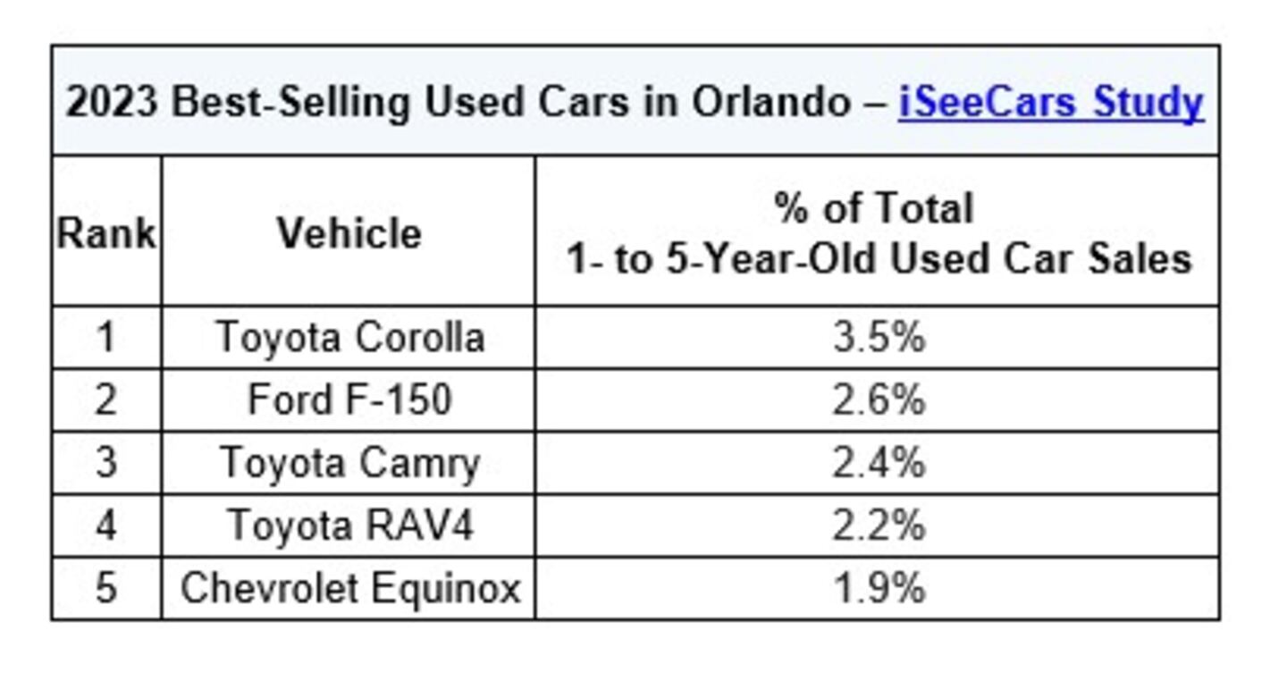 The Toyota Corolla is the best-selling used vehicle in Orlando for 2023.