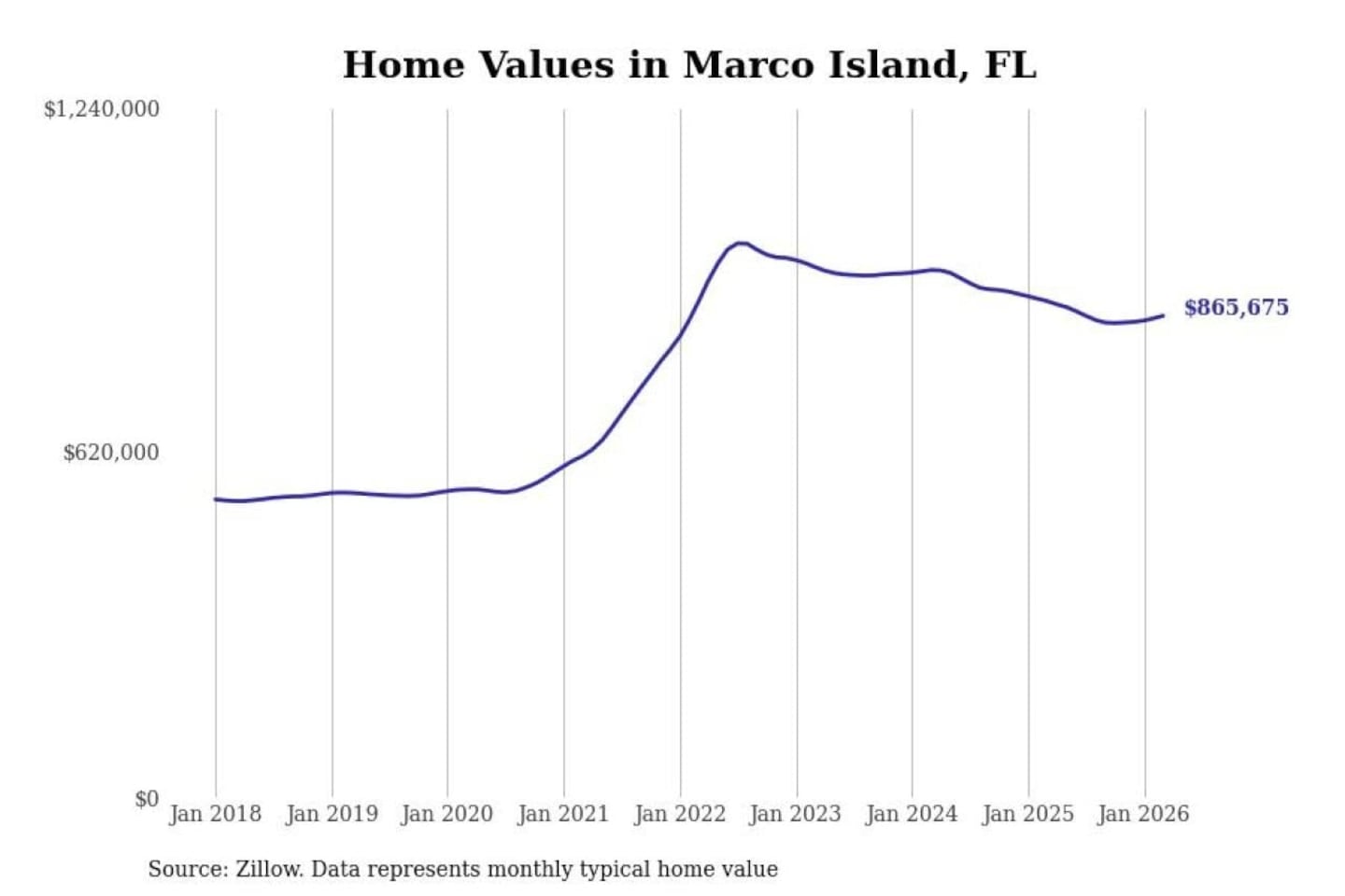 Stacker compiled a list of cities with the most expensive homes in the Naples-Marco Island, FL metro area using data from Zillow. Charts show the monthly typical home value since January 2018.