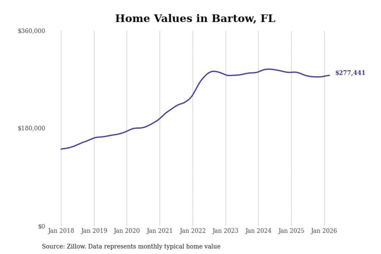Stacker compiled a list of cities with the most expensive homes in the Lakeland-Winter Haven, FL metro area using data from Zillow. Charts show the monthly typical home value since January 2018.