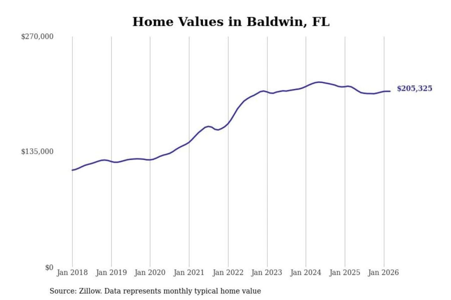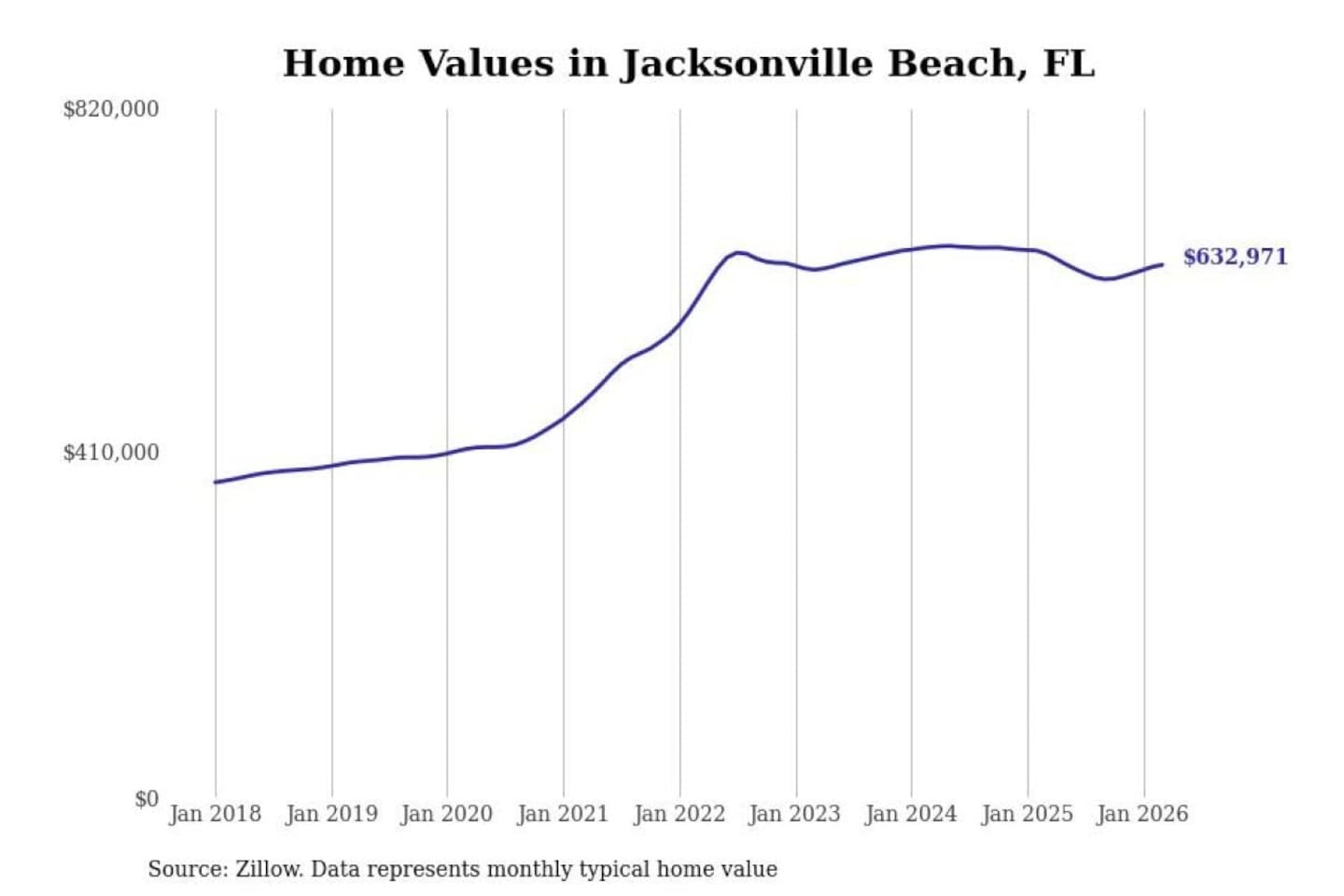 Stacker compiled a list of cities with the most expensive homes in the Jacksonville, FL metro area using data from Zillow. Charts show the monthly typical home value since January 2018.