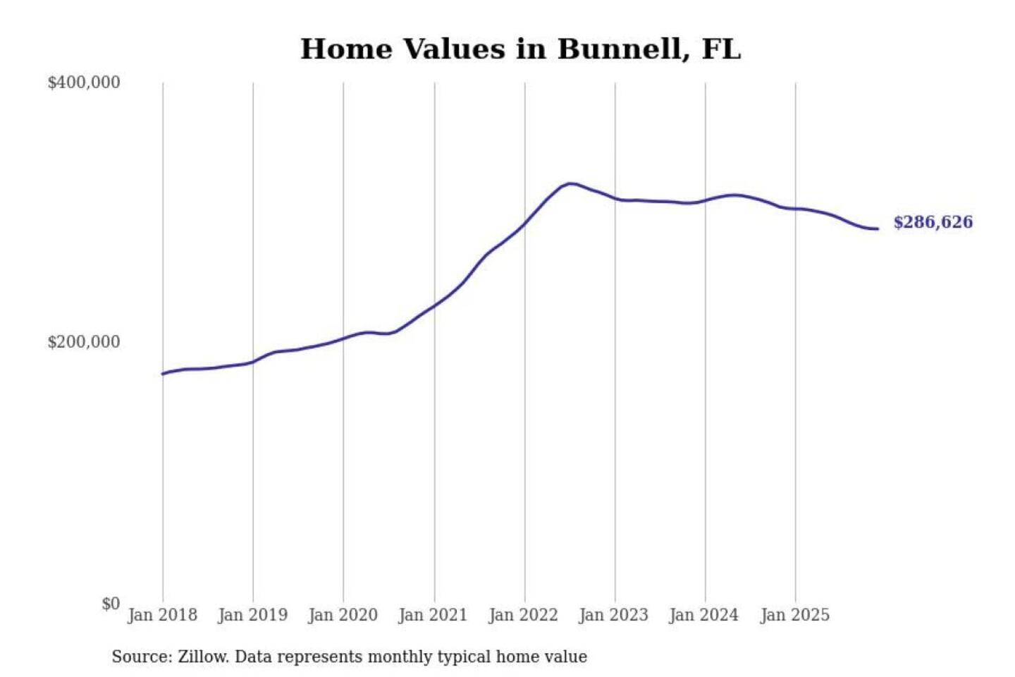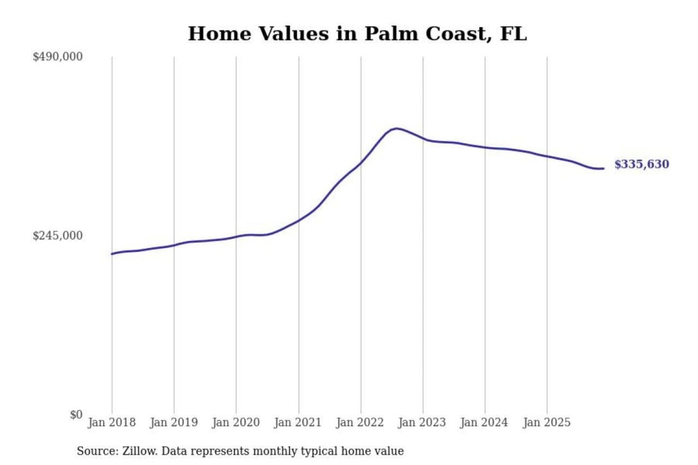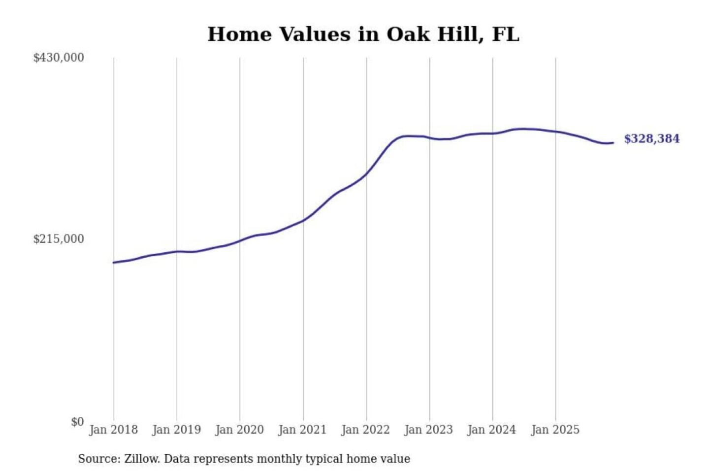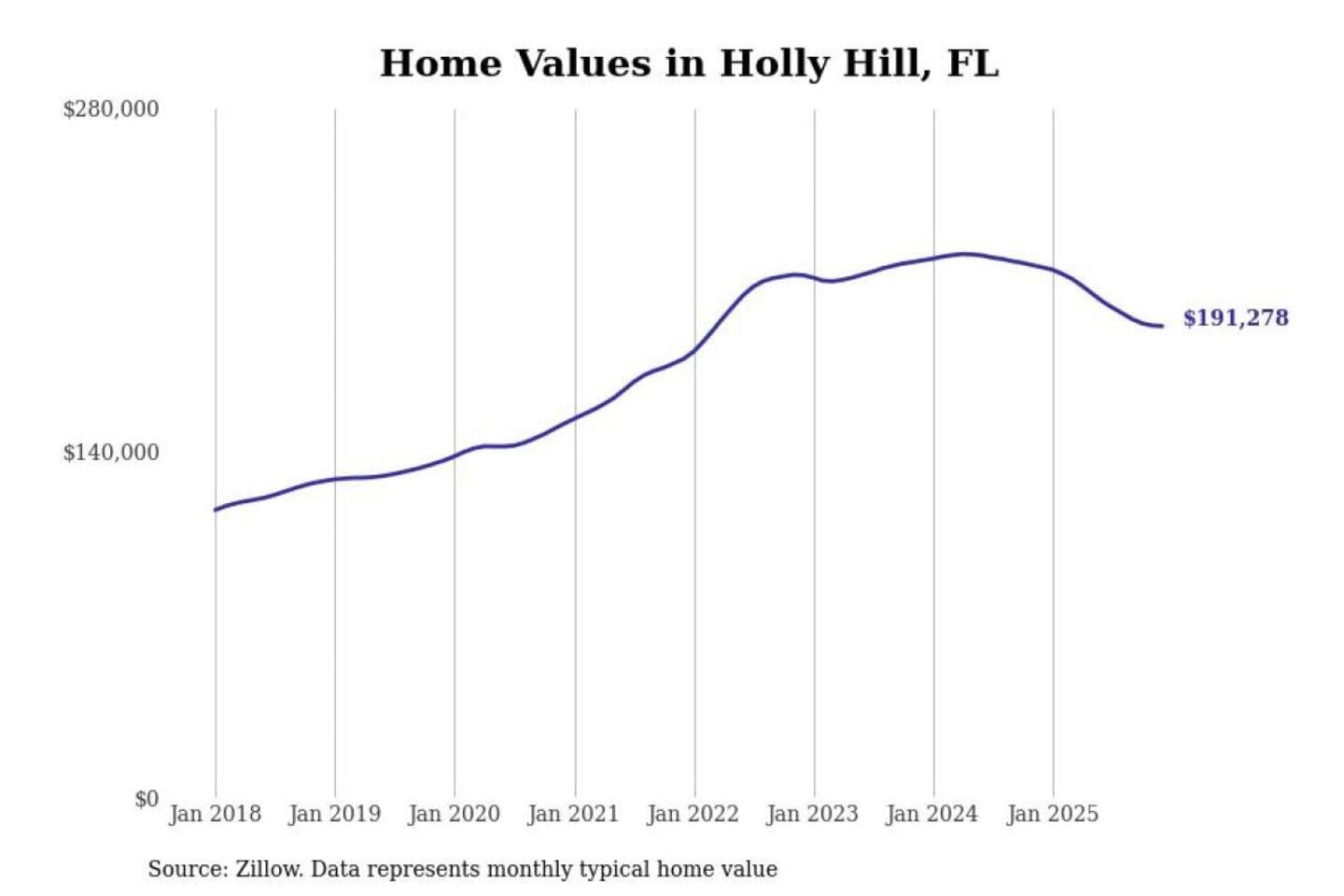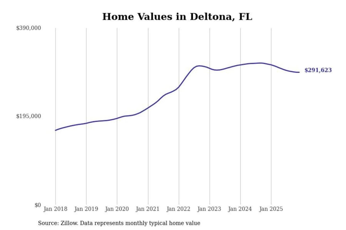 Stacker compiled a list of cities with the most expensive homes in the Deltona-Daytona Beach-Ormond Beach, FL metro area using data from Zillow. Charts show the monthly typical home value since January 2018.