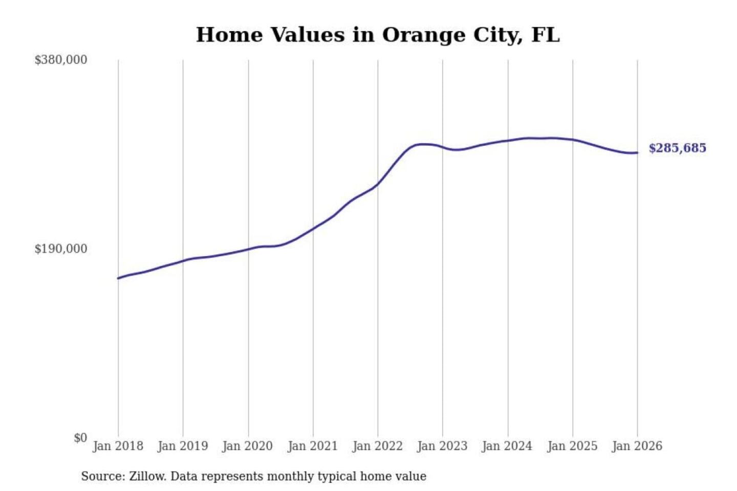 Stacker compiled a list of cities with the most expensive homes in the Deltona metro area using data from Zillow. Charts show the monthly typical home value since January 2018. All 22 cities and towns with data available were included in the list.