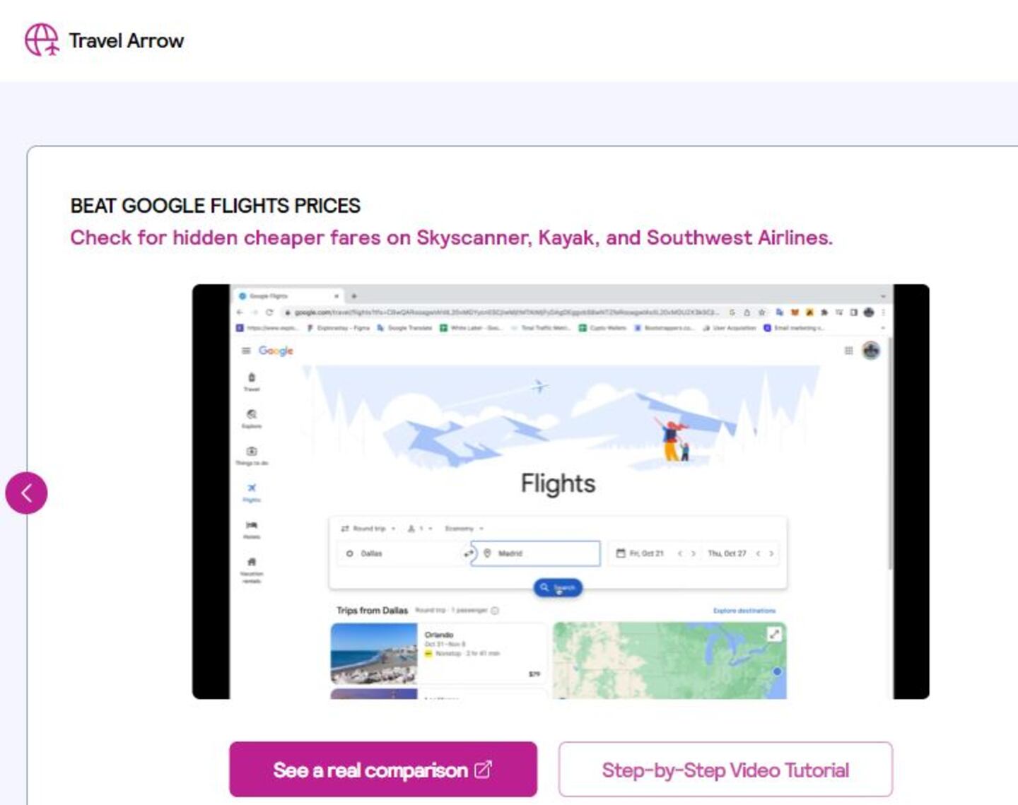 It says on the site, “TravelArrow is your travel companion. With just one click, automatically convert your exact Google Flights route onto Skyscanner and Kayak — which are travel search engines with cheaper fares. Also, convert your search directly onto Southwest Airlines – since they’re the only airline that doesn’t list fares on 3rd party websites. TravelArrow helps you access cheaper fares you’d otherwise never find!”