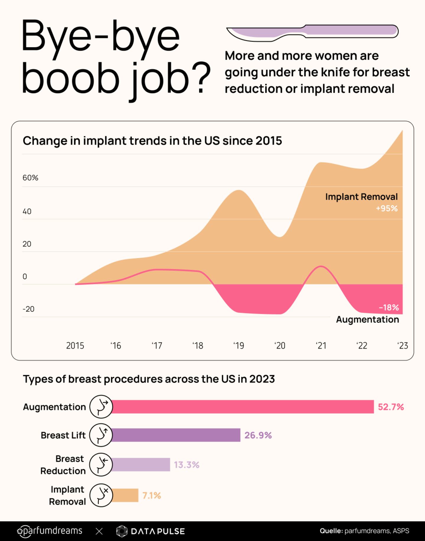 A new data analysis from parfumdreams, in collaboration with the team at DataPulse Research, shows that more and more Americans are "explanting" or removing their silicone or saline implants. The analysis shows the extent of this procedure and why it's happening.