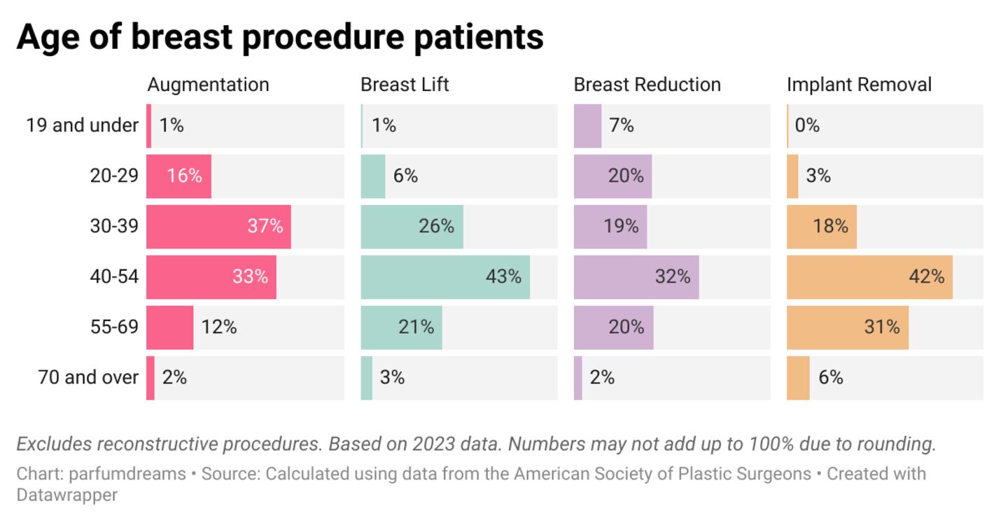 In 2015, people under 30 accounted for a third of breast enlargements, according to ASPS. But today, they account for only 17% of those surgeries. This could be due to younger generations' ideals of natural beauty: A 2024 Newsweek poll found that 38% of Gen Zers and 35% of Millennials think cosmetic surgery makes people "less attractive," versus only 26% of Gen Xers and 23% of Boomers.