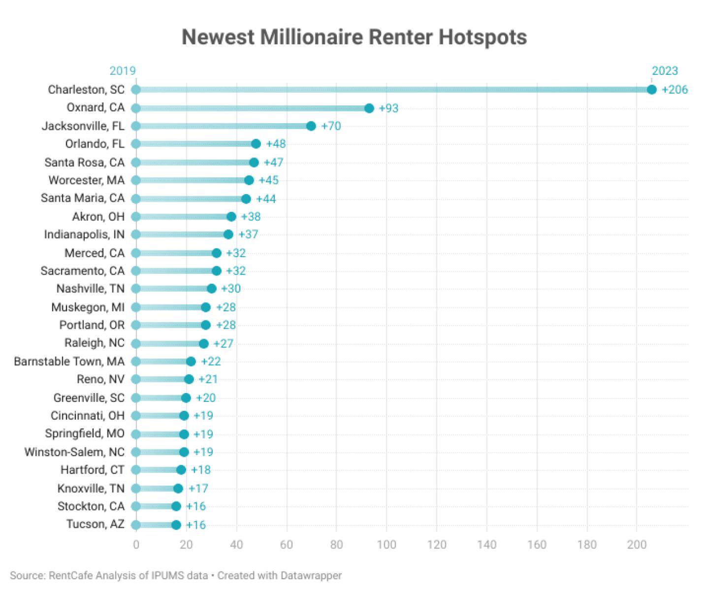 Charleston, South Carolina, leads the pack, going from zero millionaire renter households in 2019 to 206 by 2023. Charleston attracts high-earning professionals thanks to its booming tech scene and strong job market.