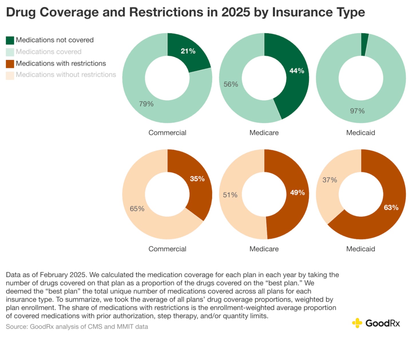 - New data from GoodRx Research shows that prescription insurance coverage is less comprehensive and more restrictive across all insurance types.