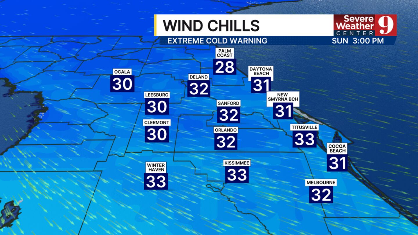 It will still be cold in Orlando; however, the wind chill will not be nearly as extreme as on Sunday morning. It could still fall to the mid-20s early Monday morning.
