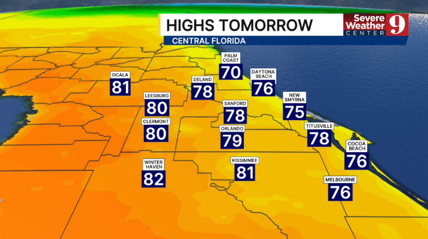 Tonight will feature quiet conditions, with just a few clouds. Morning lows will be in the low 60s.