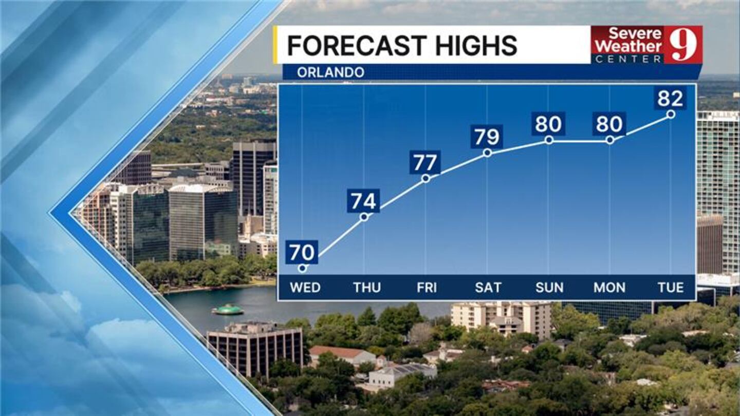Daytime highs will reach the upper 60s and low 70s on Wednesday.