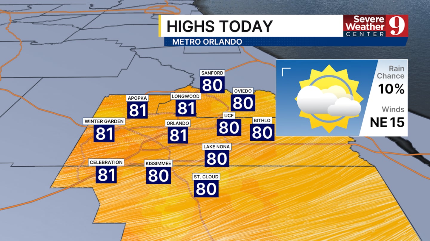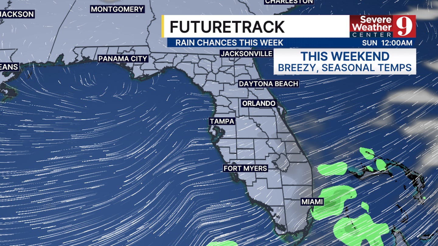 Wind will be a noticeable factor to start the weekend. In Orlando, gusts could reach up to 20 mph, while coastal areas may experience stronger gusts between 30 and 35 mph. Breezy conditions are expected to continue into Sunday before gradually easing.