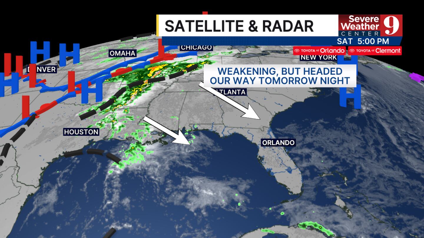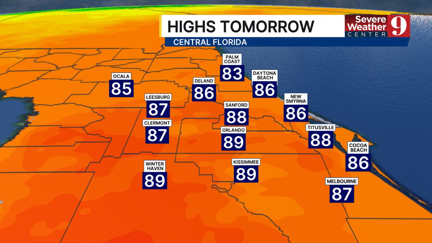 Tomorrow will be warmer, with partly cloudy skies and winds out of the SW helping boost our temperatures. Highs will reach the mid- to upper 80s tomorrow, 89 in Orlando.