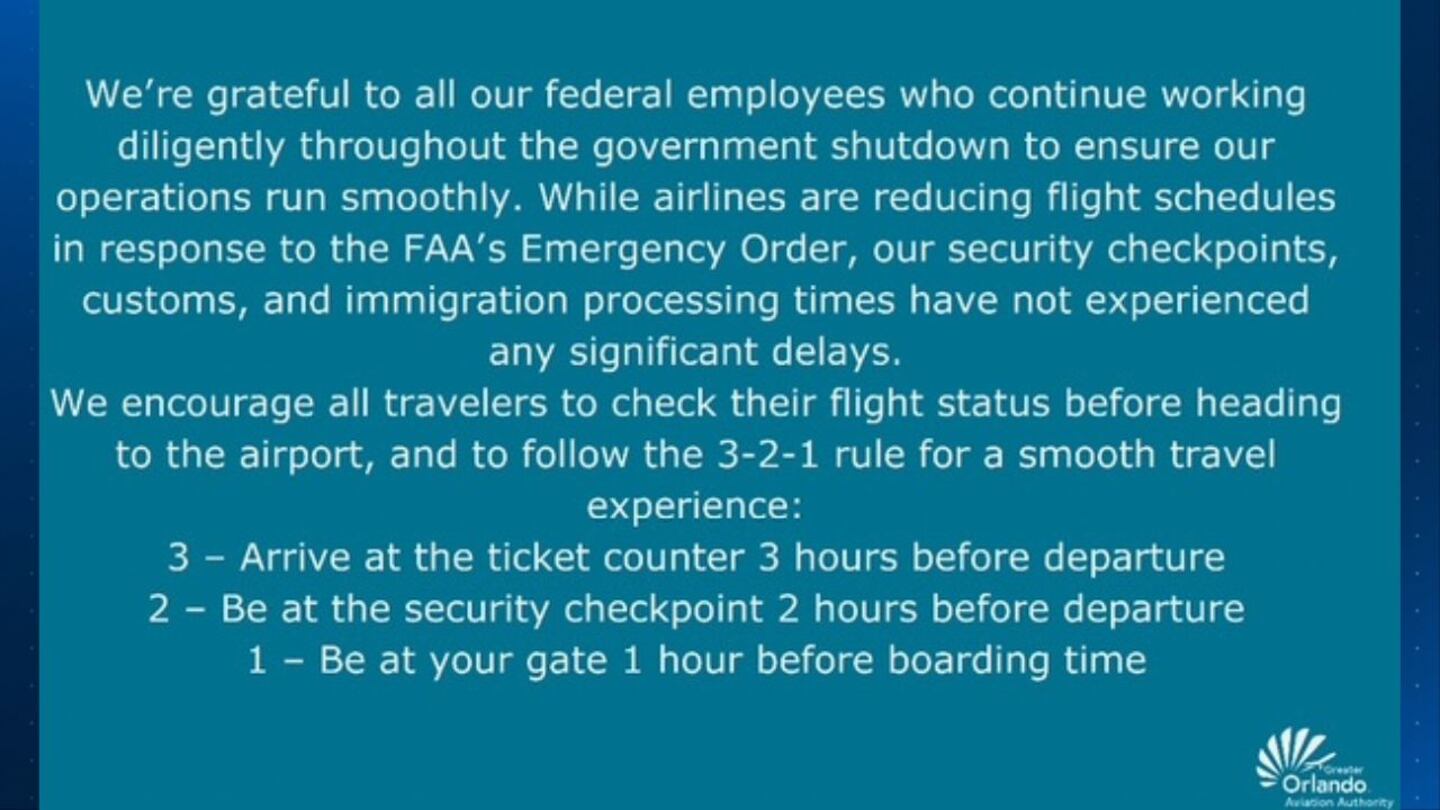 Below is the statement from the Greater Orlando Aviation Authority (GOAA) regarding federal employees working during the ongoing government shutdown in Central Florida.