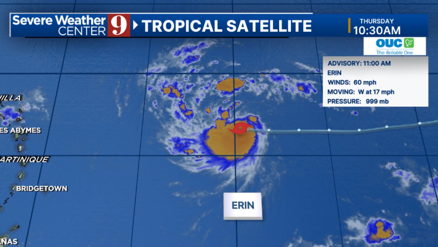 ORLANDO, Fla. — Tropical Storm Erin is strengthening in the open Atlantic and will likely become a hurricane in the next 24 hours.