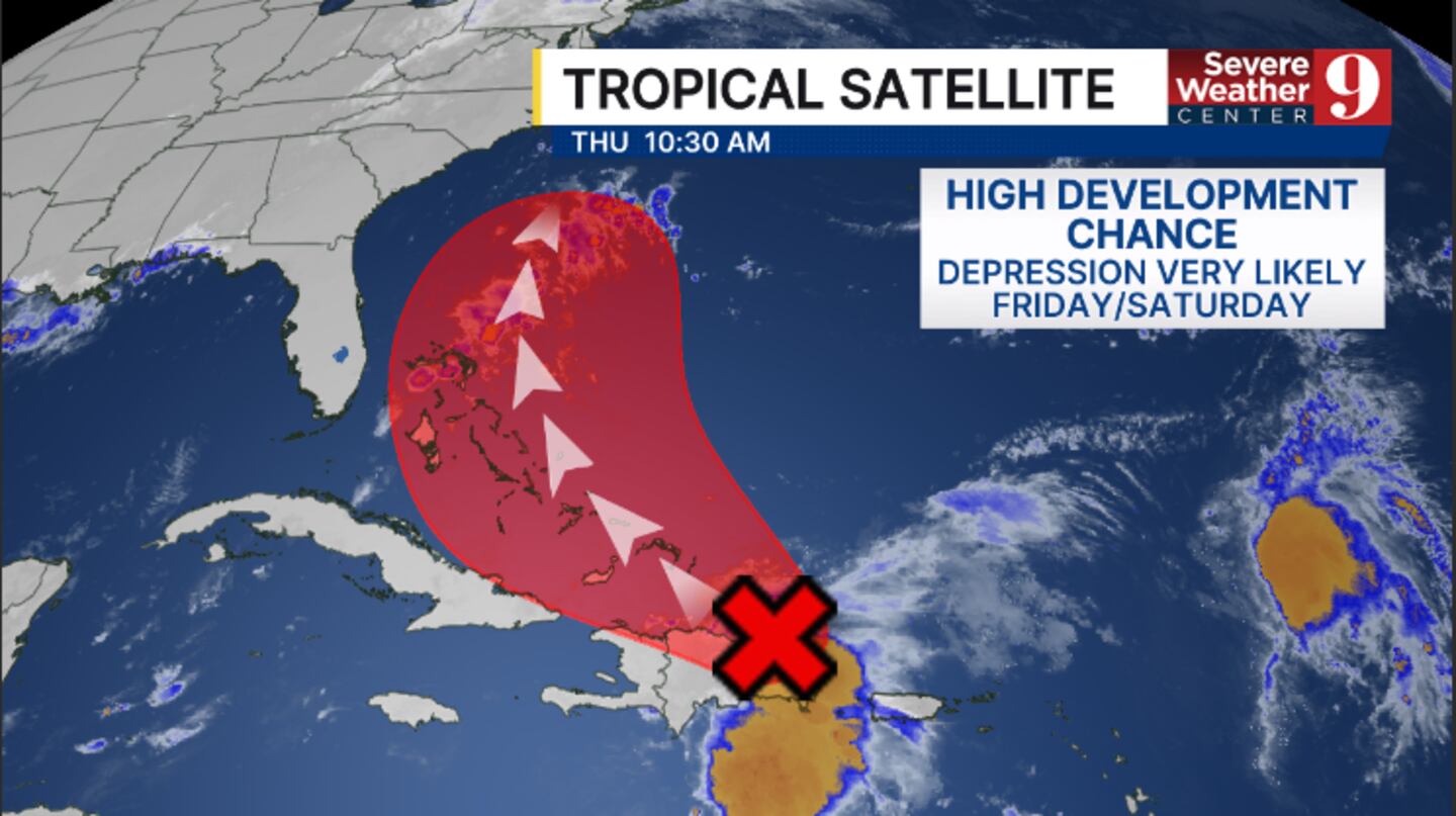 The system is likely to develop near the Turks and Caicos by Saturday, potentially impacting parts of the Bahamas with heavy rain and gusty winds.