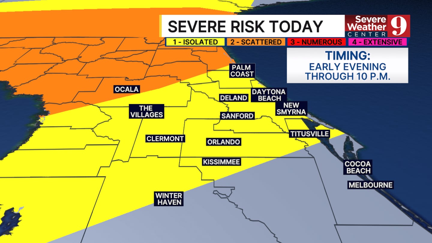 Severe storms need heat, instability and rising air created by a warm ground to build. Since Orlando’s timing will be during the evening the chances of a severe storm developing are significantly less than our northern counties such as Marion, Flagler and Volusia.