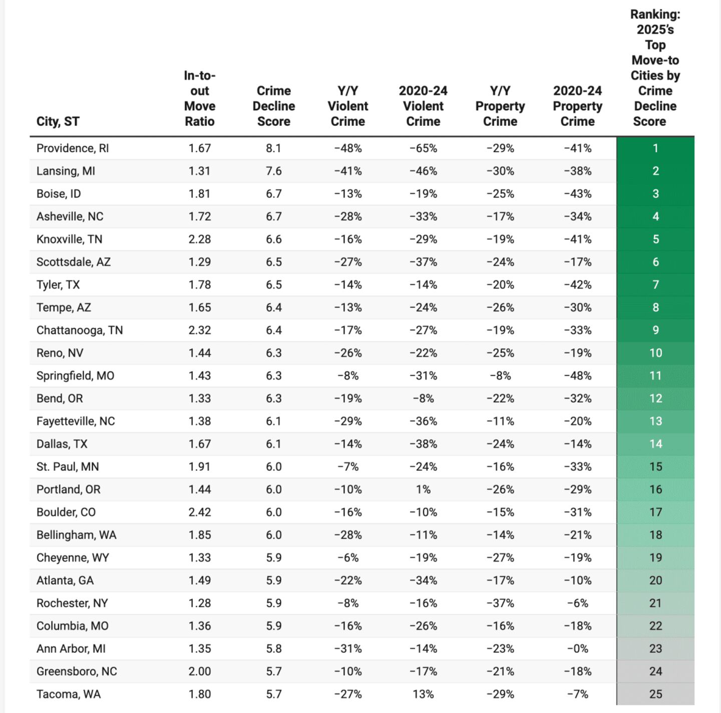 - Providence, Rhode Island, is the city with the highest move interest where crime fell fastest. Violent crime since 2020 dropped 65%, across the same period property crime dropped 41%. Runners-up are Lansing, Michigan, Boise, Idaho, Asheville, North Carolina, and Knoxville, Tennessee.