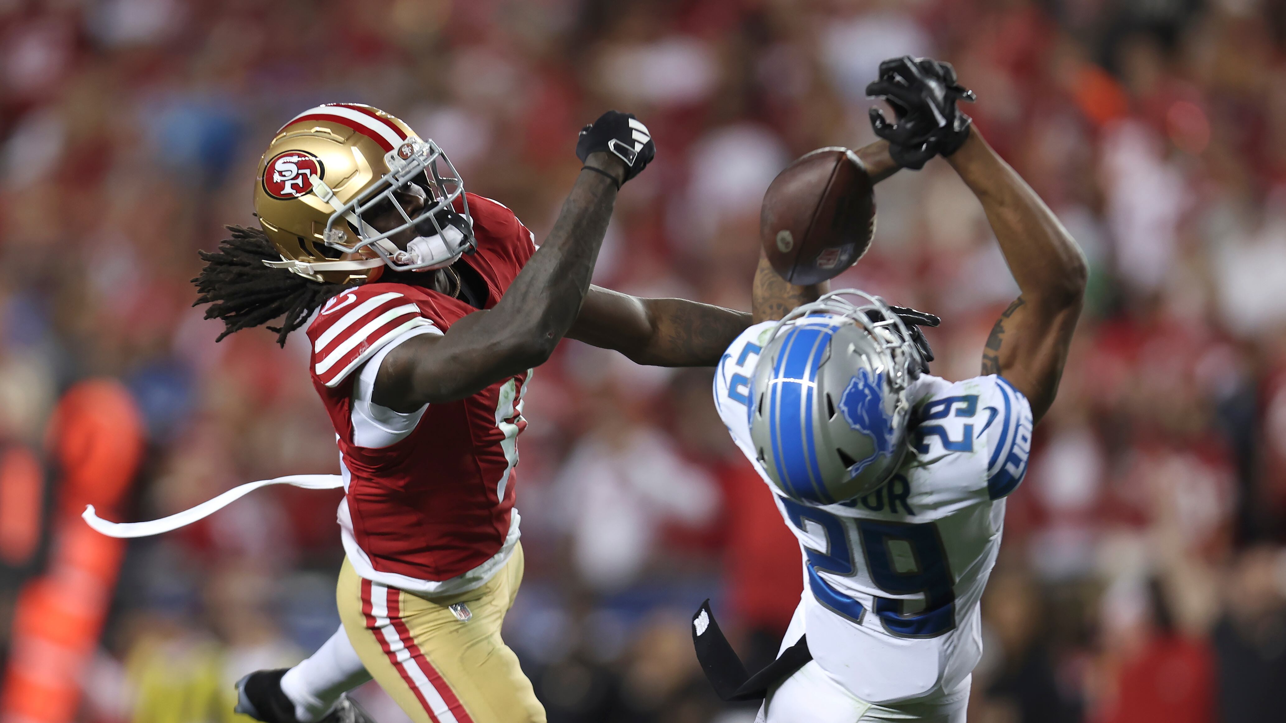 With San Francisco trailing the Detroit Lions 24-10 in the third quarter, Brock Purdy looked deep to Brandon Aiyuk on first-and-10 from the 49ers' 45-yard line. He missed his target with an overthrow that Vildor had a chance to intercept. Instead, the ball bounced off Vildor's hands and then his facemask and into the hands of a diving Aiyuk at the 4-yard line.