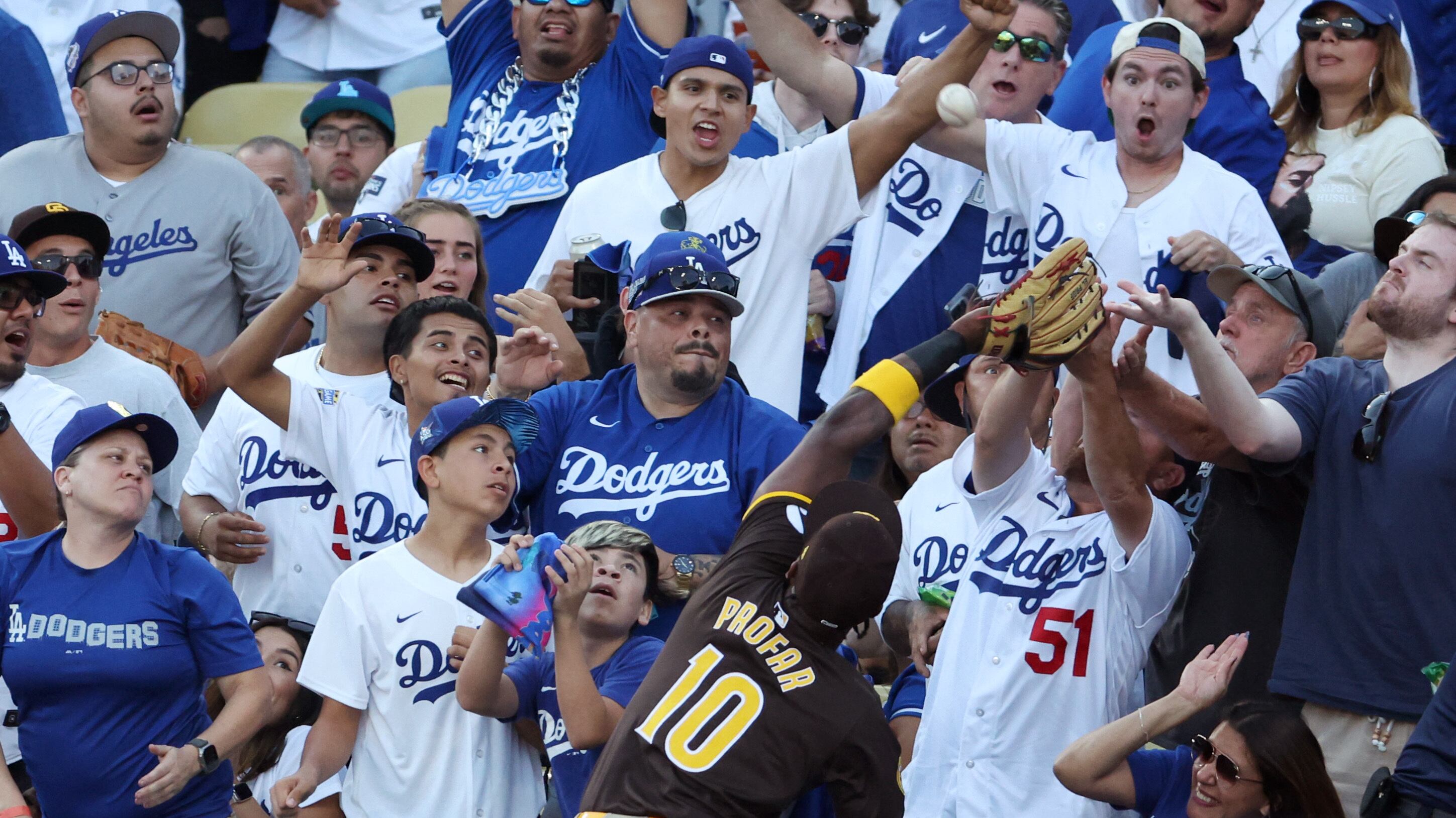 Profar jumped and leaned over the wall as Dodgers fans fought him to catch the ball. When he landed, he stared down the fans and hopped up and down. Betts broke into a home-run trot, and the Fox broadcast put a run on the board and declared that Betts had hit a home run.