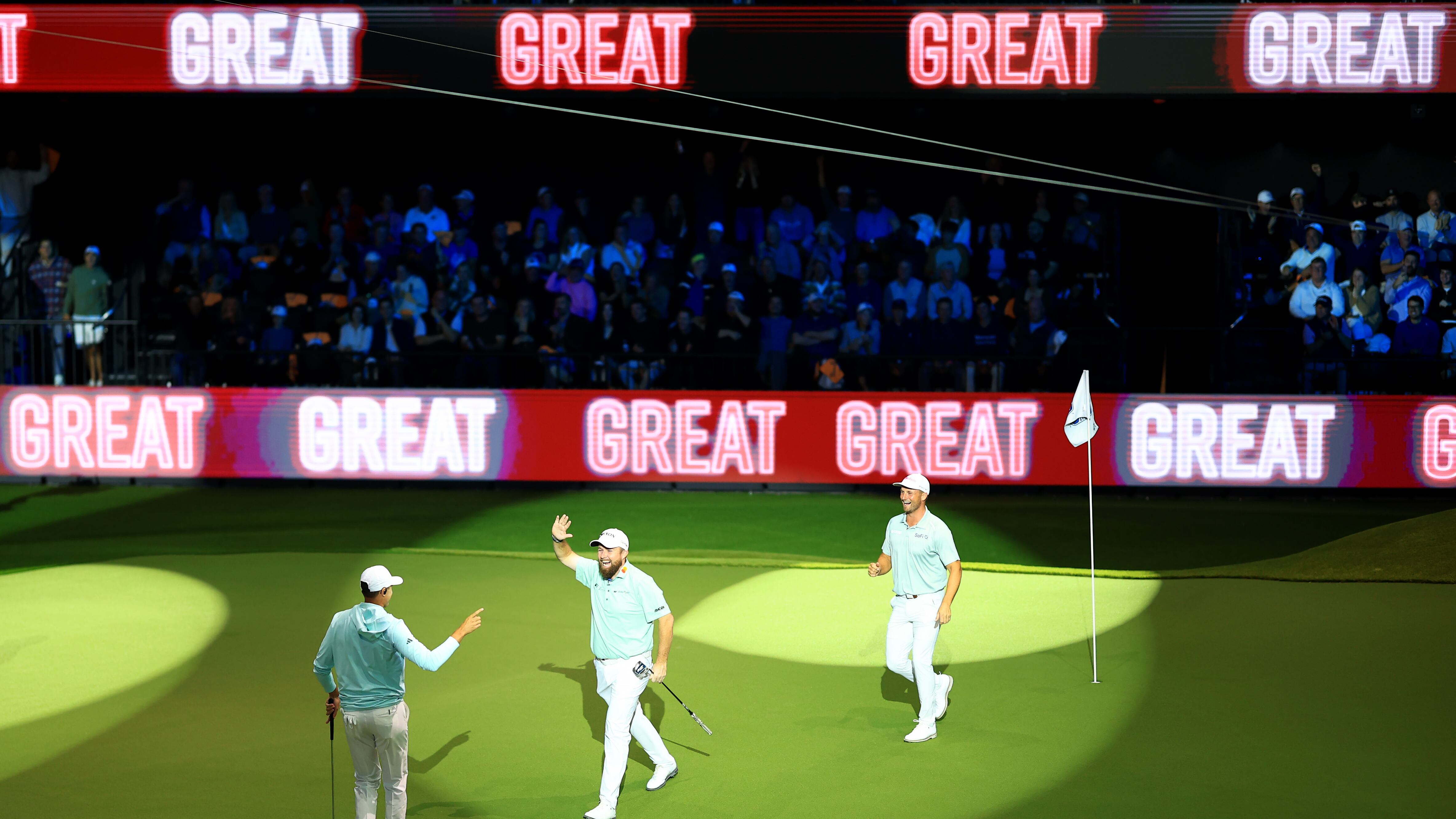 TGL presented by SoFi: NY v BAY PALM BEACH GARDENS, FLORIDA - JANUARY 07: Ludvig Aberg of The Bay Golf Club is congratulated by Shane Lowry and Wyndham Clark after a putt on the fifth green during their TGL presented by SoFi match against the New York Golf Club at SoFi Center on January 07, 2025 in Palm Beach Gardens, Florida. (Photo by Mike Ehrmann/TGL/TGL Golf via Getty Images) (Mike Ehrmann/TGL/TGL Golf via Getty Images)