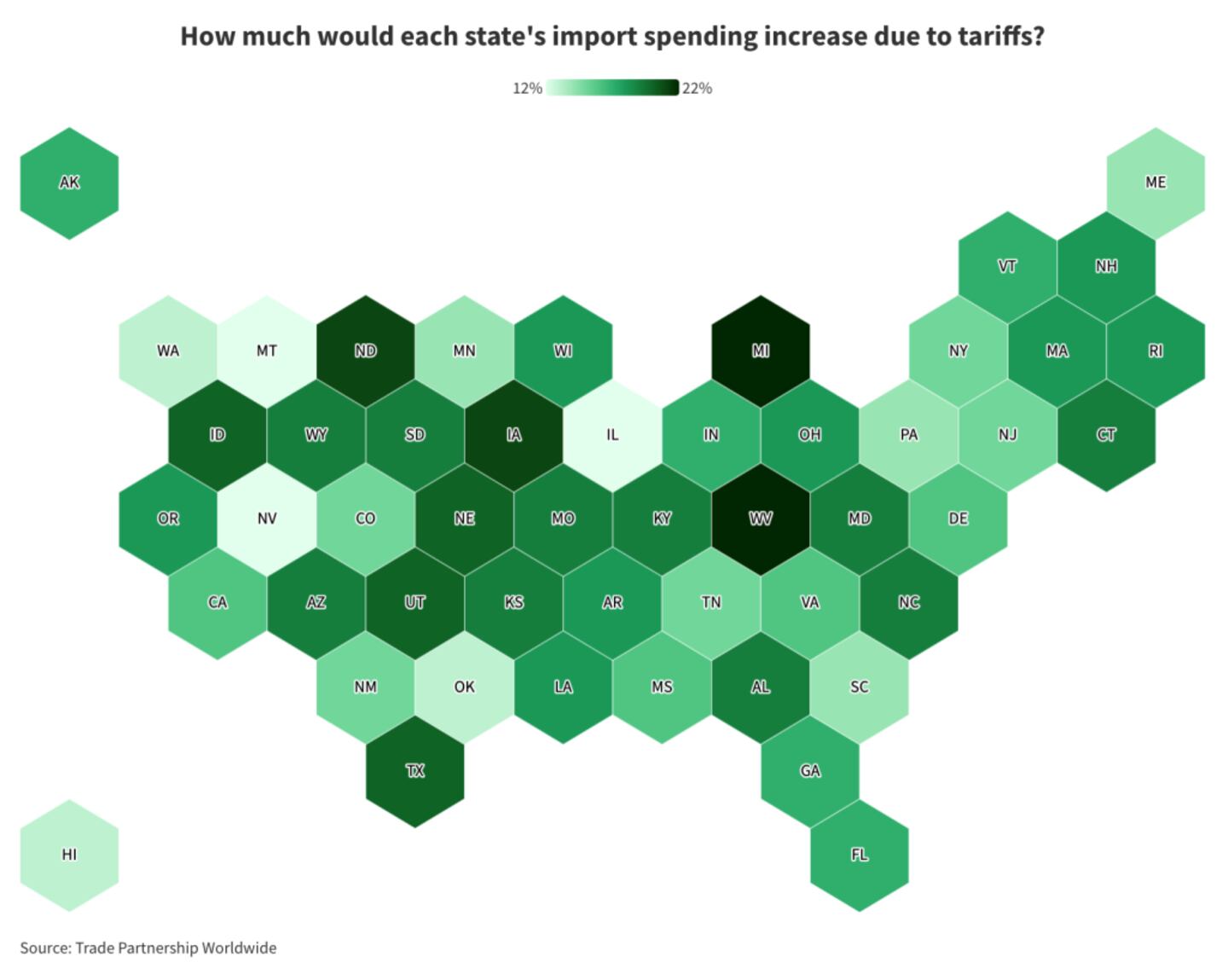 Tariffs may be national policy, but their impact plays out at the state level in dollars, jobs, and rising costs. From the farm fields of California to the auto plants of Michigan, nearly every region is seeing higher import costs and added pressure on key industries.