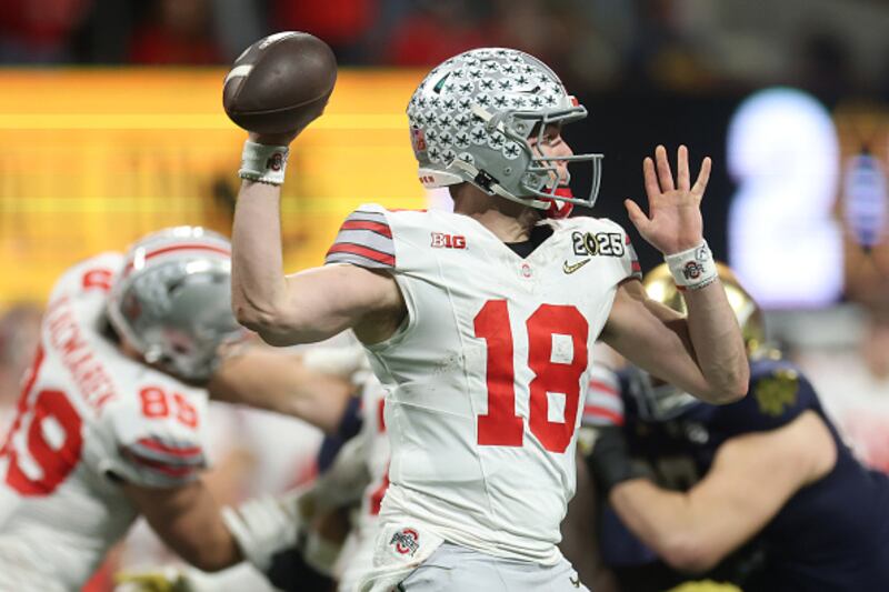 2025 CFP National Championship Presented by AT&T- Ohio State v Notre Dame ATLANTA, GEORGIA - JANUARY 20: The Ohio State Buckeyes celebrate with the trophy after beating the Notre Dame Fighting Irish 34-23 in the 2025 CFP National Championship at the Mercedes-Benz Stadium on January 20, 2025 in Atlanta, Georgia. (Photo by Paras Griffin/Getty Images) (Paras Griffin/Getty Images)