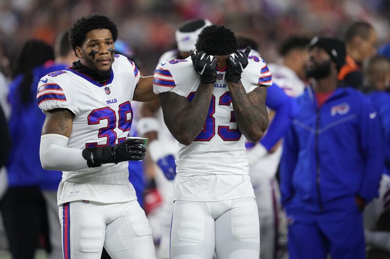 Buffalo Bills safety Damar Hamlin collapses, receives CPR on field CINCINNATI, OHIO - JANUARY 02: Cam Lewis #39 and Siran Neal #33 of the Buffalo Bills react to teammate Damar Hamlin #3 collapsing after making a tackle against the Cincinnati Bengals during the first quarter at Paycor Stadium on January 02, 2023 in Cincinnati, Ohio. (Photo by Dylan Buell/Getty Images) (Dylan Buell/Getty Images)