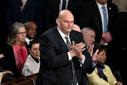State of the Union: Sen. John Fetterman of Pennsylvania applauds during the State of the Union address. Fetterman, known for his casual wear in the Senate, wore a suit and tie for Tuesday's speech. (Bloomberg/Bloomberg via Getty Images)