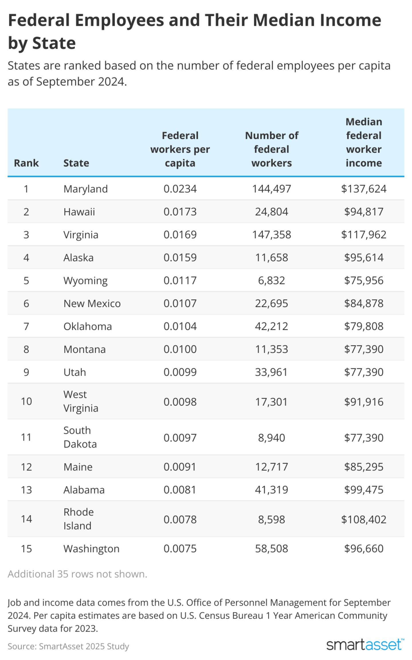 Data for federal employment comes from the U.S. Office of Personnel Management as of September 2024. Per capita estimates for this SmartAsset study are based on the latest U.S. Census Bureau population estimates from the 1-Year American Community Survey for 2023.